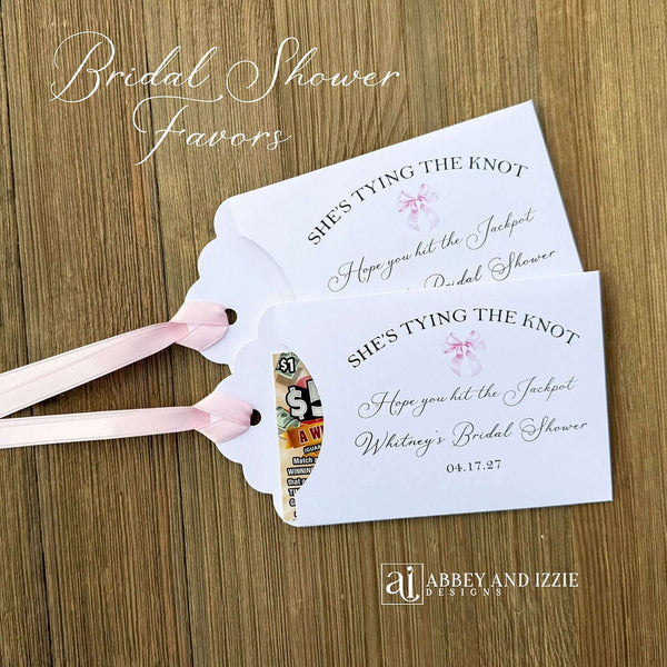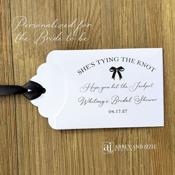Pink Bow Bridal Shower Guest Favors,  Celebrate your bride-to-be with these charming  favors that guests will adore  Each favor can be customized with names, date, She's Tying the Knot, Hope you hit the Jackpot.  Printed on white card stock,  your choice of pink or black bow or pink or black ribbon.  Perfect for creating Instagram-worthy moments and lasting impressions, these thoughtfully designed pieces transform simple thank-yous into fun interactive favors. Make your bridal shower unforgettable with favors as special as the occasion itself.