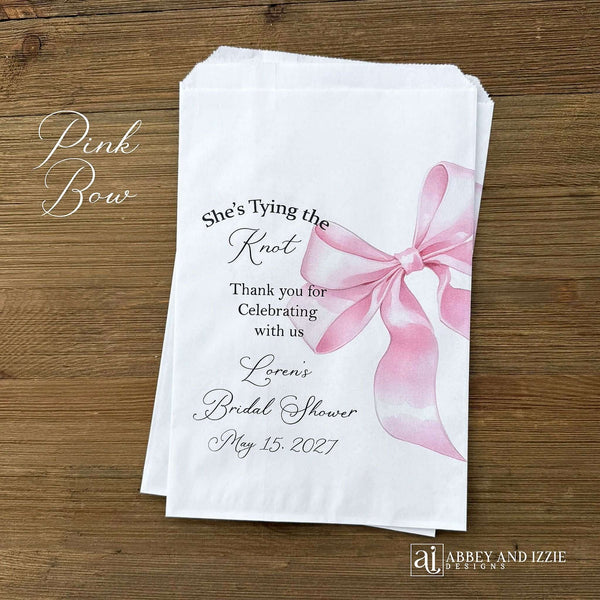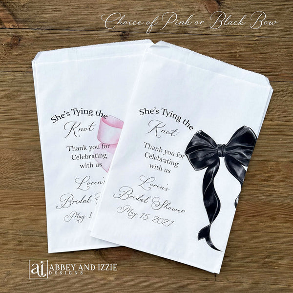 She's Tying the Knot Bridal Shower Favor Bags measure 6 1/4" wide x 9 1/4" high, larger than most candy bags. Bags are non grease resistant we recommend pre-packaging of baked or oily goods in a plastic bag. Contents not included, minimum order 25.