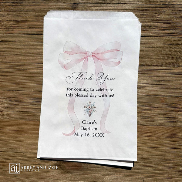 Pink Bow Baptism Favor Bags Personalized measure 6 1/4" wide x 9 1/4" high. They are are non grease resistant we recommend pre-packaging of baked or oily goods in a plastic bag. Contents not included, minimum order 25 bags.