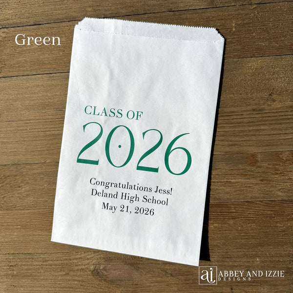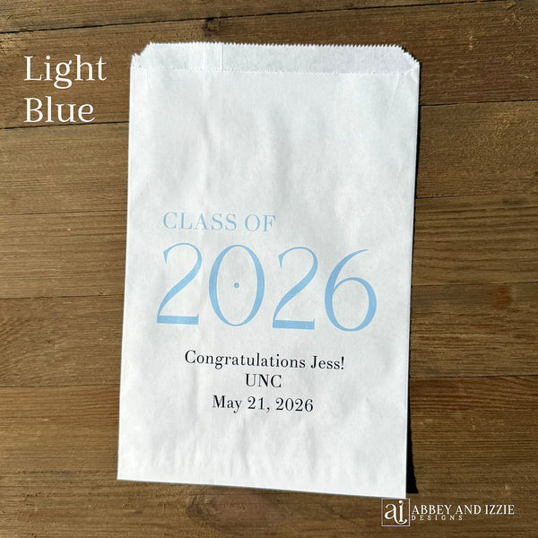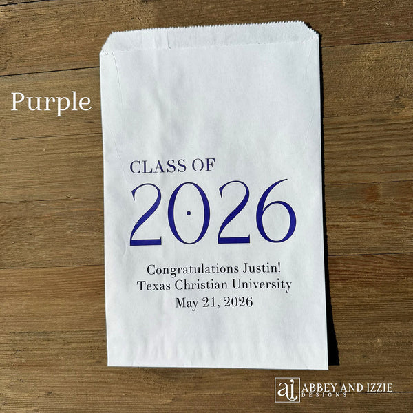 Celebrate the Class of 2026 with Personalized Favor Bags. Fill with candy, cookies, pretzels, popcorn or utensils. Graduation bags are personalized with the graduates name and school, YOUR CHOICE OF CLASS OF 2026 COLOR. The printed color may appear different than what is seen on the screen due to variations in computer monitors as well as phones and tablets. Each of our favor bags measures 6 1/4" wide x 9 1/4" high, larger than most candy favor bags, made of white paper. These can be modified for multiple graduates, one school or Class of printed at the bottom. Contents NOT included. Bags are non grease resistant we do recommend pre-packaging baked or oily goods in a plastic bag. Celebrate the Class of 2026 with Personalized Favor Bags, so fun!