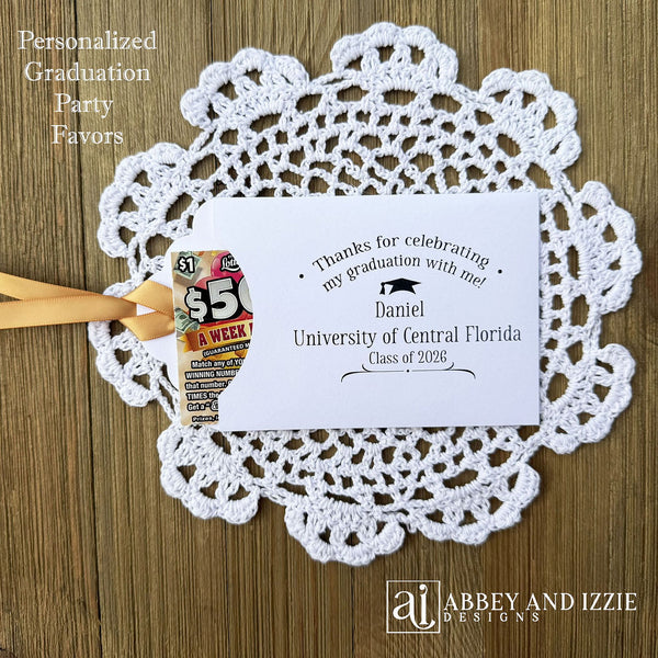 Fun Graduation Party Favors Personalized, Lottery Ticket Favors, what a nice way to say thank you to your guests, give them a chance to win big! Our graduation party favors are personalized with the graduates name and class of year. Printed on white card stock with your choice of ribbon color to match your party theme. Fun Graduation Party Favors Personalized measure 5 3/4" x 3 3/8", ribbon is included and comes attached. Lottery tickets are NOT included with your purchase.