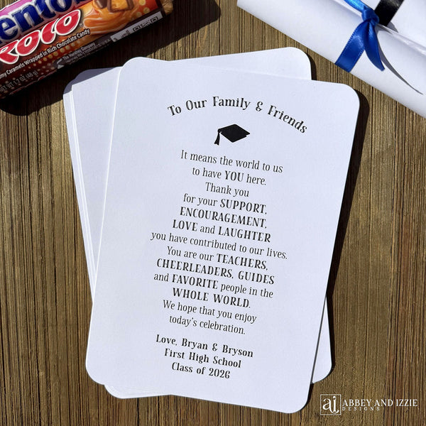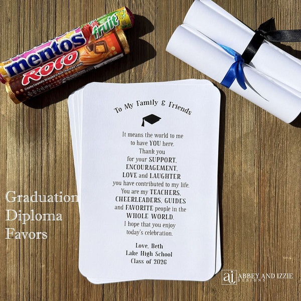 These adorable Graduation Diploma Favors are sure to be a hit! Once you roll these up around a pack of Rolos or Mentos, tie a ribbon around them and they look just like a diploma. Each Graduation Diploma Favors is personalized with the graduates name and school, with a saying that let's your guests know how important they are in the Grad's life. These can be used for a high school grad or college grad. Each of our Graduation decorations measures 5 1/4" WIDE x 7 1/2" HIGH, constructed out of 110# white card stock. GRADUATION FAVORS SHIP FLAT, CANDY AND RIBBON ARE NOT INCLUDED with your purchase.