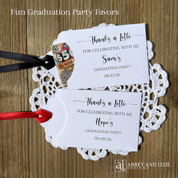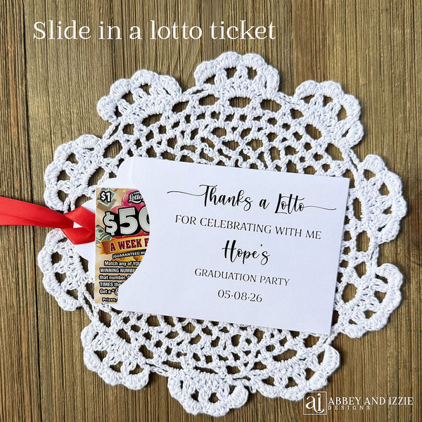 Thanks a Lotto Graduation Party Favors . Lottery ticket favors for a unique party favor to thank your guests for celebrating with you. Add some fun to your party and see who wins big with these scratch off ticket holders. Each envelope will be printed on white card stock with your choice of ribbon color. Our Thanks a Lotto Graduation Party Favors measure 5 3/4" X 3 3/8", ribbon is included and comes attached. Lottery tickets are NOT included with your purchase.