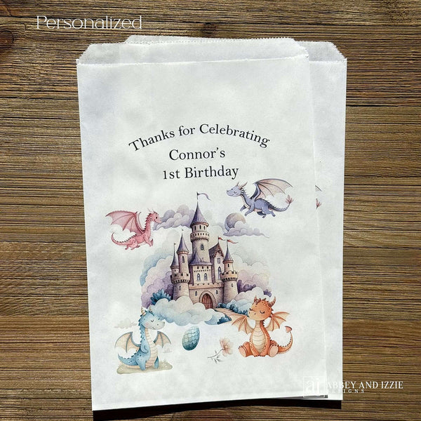 Delight your young dragon enthusiasts with these personalized dragon birthday favor bags—the perfect way to send guests home with a magical memento. Each dragon birthday favor bag can be customized with your child's name, making every guest feel specially chosen for the celebration. Ideal for dragon-themed parties, these favor bags add a personal touch that transforms a simple giveaway into a cherished keepsake. Fill them with treats, toys, or small gifts for a presentation that captures the excitement and wonder of the party. Make your child's special day unforgettable with Dragon Birthday Favor Bags as unique and special as they are.