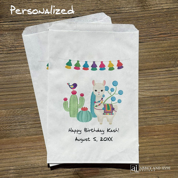Your guests will love these adorable Llama Birthday Party Favor Bags, perfect for a llama party! Our llama birthday favors are personalized for the guest of honor. Fill these favor bags with what ever you choose, perfect for candy buffets or cookie buffets, the possibilities are endless! Llama Birthday Party Favor Bags will accent the party. The Bags measure 6 1/4" wide x 9 1/4" high, larger than most candy favor bags. Bags are non grease resistant we recommend pre-packaging of baked or oily goods in a plastic bag. Contents not included.