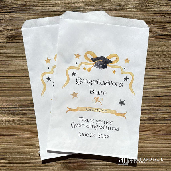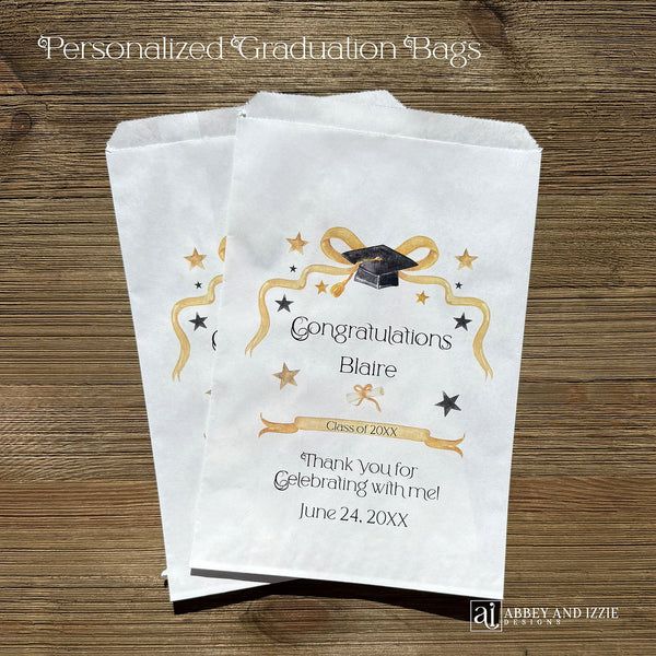 Celebrate your graduate in style with personalized Graduation party favor bags that guests will treasure. These custom bags add a meaningful touch to any graduation celebration, transforming simple tokens of appreciation into memorable keepsakes. Perfect for distributing treats, small gifts, or utensil bags, each bag can be personalized with your graduate's name, class year, and event date. Durable and elegantly designed, these favor bags elevate your event while keeping costs reasonable. Make your graduation party unforgettable with a detail that shows thoughtfulness and care.
